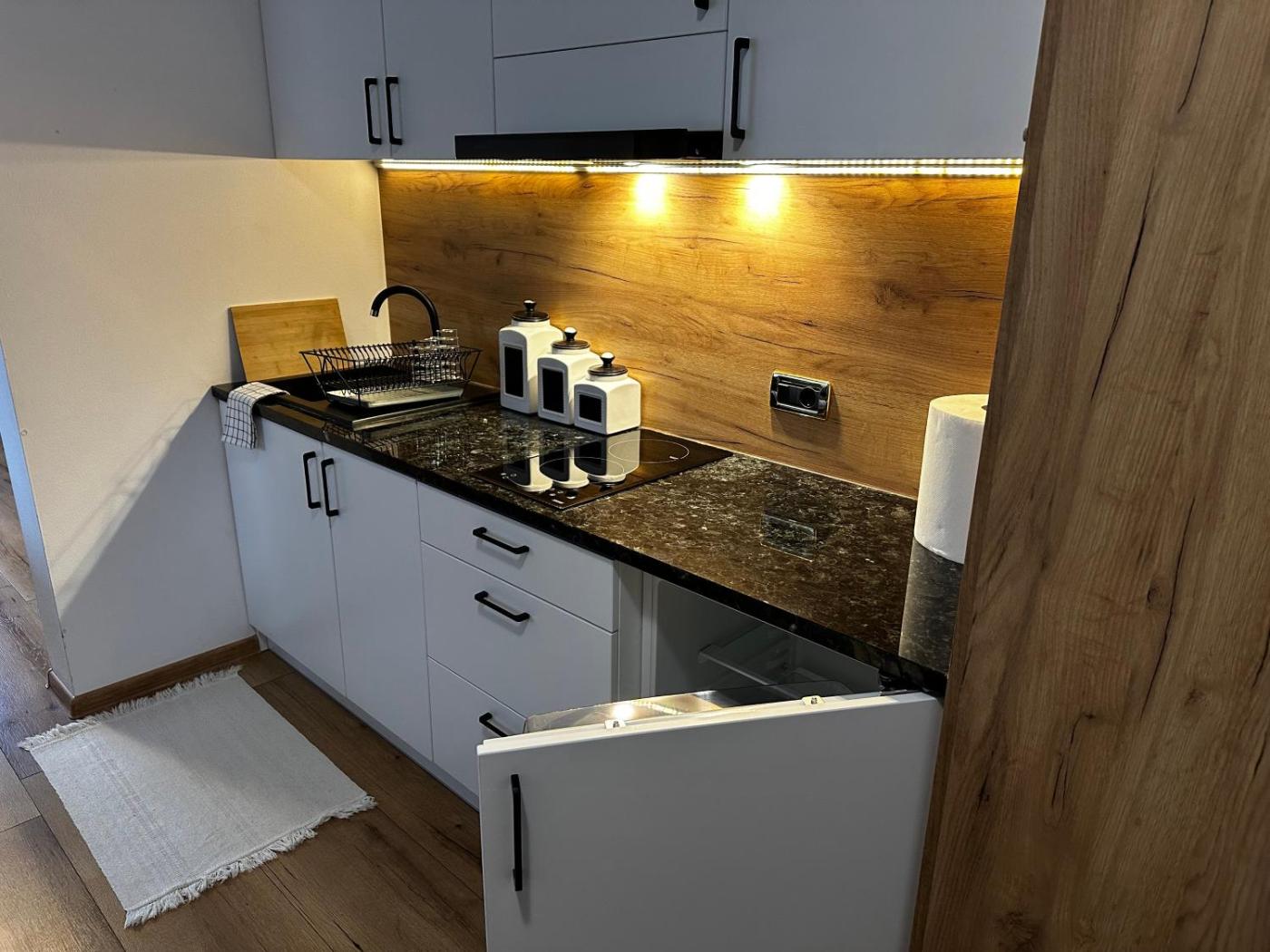Pokój czteroosobowy z widokiem na góry. W aneksie kuchennym znajduje się lodówka, kuchenka mikrofalowa oraz zestaw do parzenia kawy i herbaty. Goście zatrzymujący się w tym pokoju czteroosobowym mogą korzystać z grilla. Udogodnienia w tym pokoju czteroosobowym obejmują prywatną łazienkę oraz telewizor z płaskim ekranem i dostępem do serwisów streamingowych. Znakomitym miejscem na relaks jest taras z widokiem na ogród. W tej opcji zakwaterowania dostępne są 3 łóżka. Pokój Czteroosobowy - 4 osobowy. Powierzchnia pokoju ok.: 30 mkw. ;