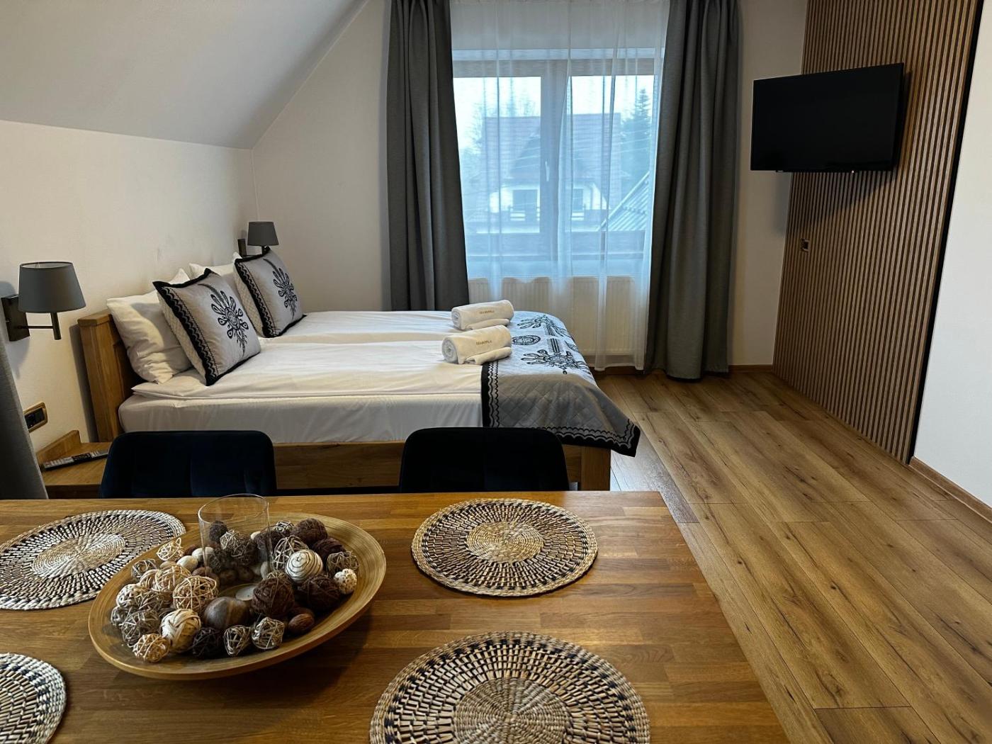 Pokój Dwuosobowy z widokiem na góry. Jest to pokój dwuosobowy z dźwiękoszczelnymi ścianami, zestawem do parzenia kawy i herbaty, tarasem z widokiem na ogród oraz prywatną łazienką z kabiną prysznicową. Do dyspozycji gości jest 1 łóżko. Pokój Dwuosobowy - 3 osobowy. Powierzchnia pokoju ok.: 20 mkw. ;