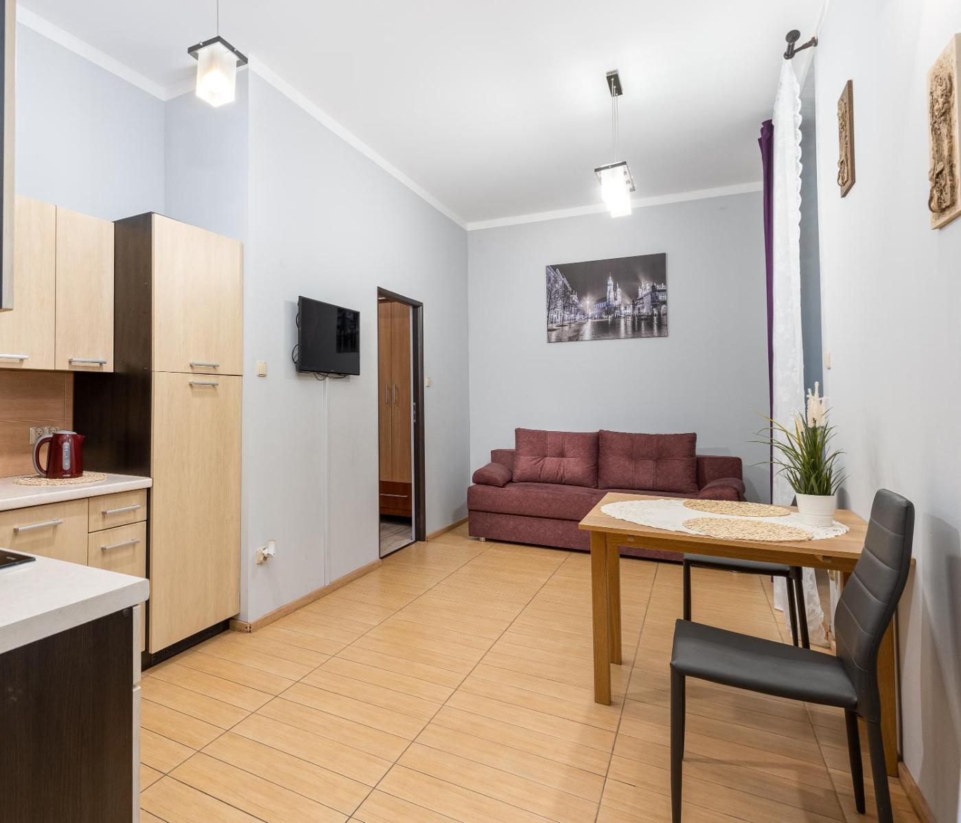 W apartamencie zapewniono sypialnię (1), salon oraz kuchnię z pełnym wyposażeniem.