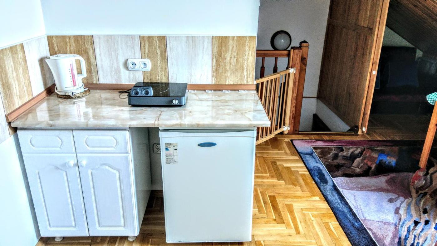 Wyposażenie obejmuje także lodówkę, płytę kuchenną i czajnik.